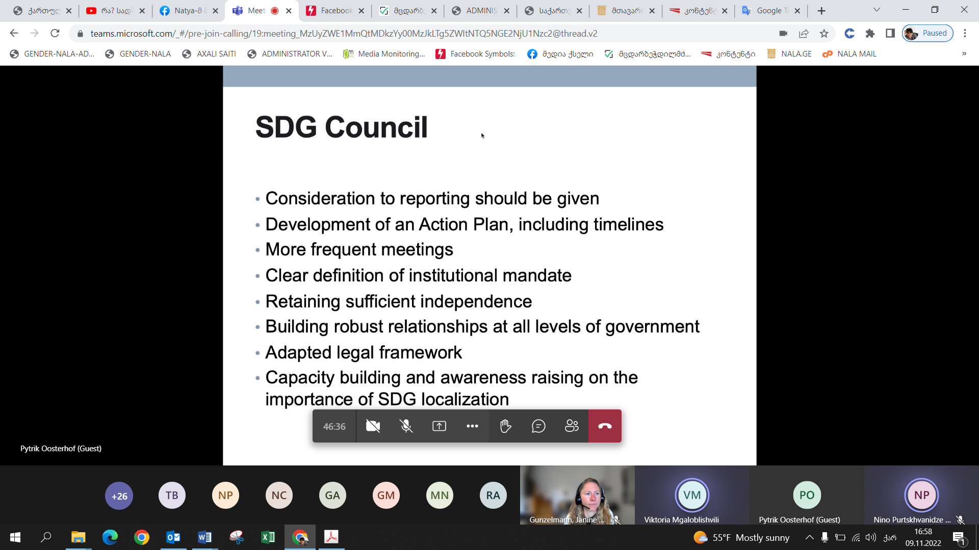 შეხვედრის ფარგლებში, მონაწილეები, ასევე საქართველოს SDG-ის საბჭოს მრავალდონიან მექანიზმად ადაპტაციის მხარდაჭერის მიზნით, შემუშავებული ანგარიშის სამუშაო ვერსიას გაეცნენ, რის შემდეგაც, საქართველოში მდგრადი განვითარების ამჟამინდელი ინსტიტუციური სტრუქტურა და SDG საბჭოში ადგილობრივი ხელისუფლებისა და დაინტერესებული მხარეების ინტეგრაციის ძირითადი ასპექტები მიმოიხილეს.
