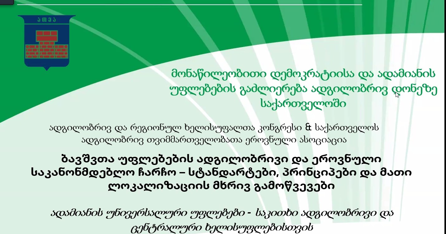 ადგილობრივ დონეზე ბავშვთა უფლებების დაცვის ხელშეწყობის მიზნით, ევროპის საბჭოს კონგრესისა და საქართველოს ადგილობრივ თვითმმართველობათა ეროვნული ასოციაციის ინიციატივით, მაღალი დონის სამუშაო შეხვედრა გაიმართა.